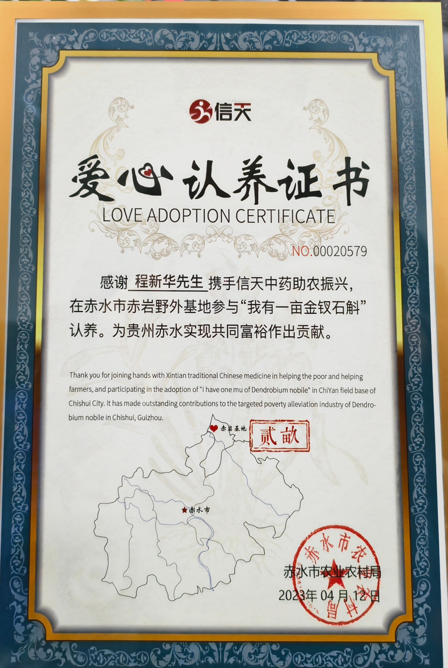 爱心认养证书